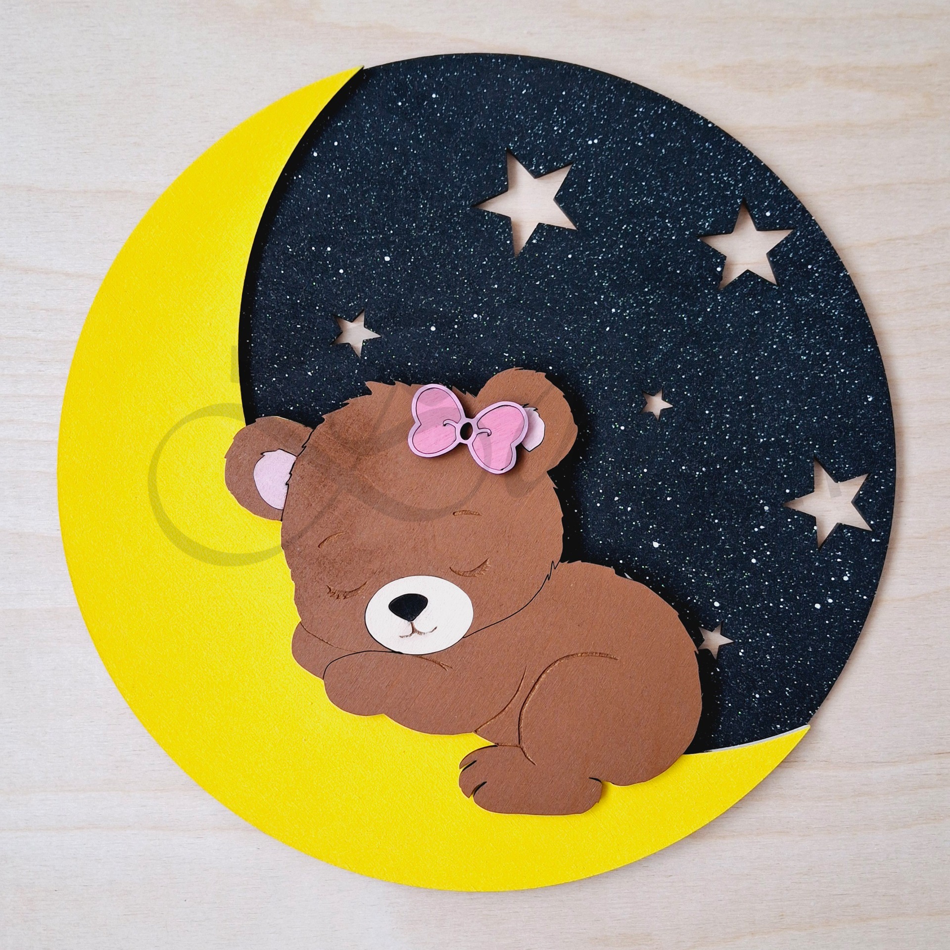 Az alvó maci a holdon egy meghitt, álomszerű hangulatot varázsol, amely tökéletes kiegészítője lehet minden babaszobának.